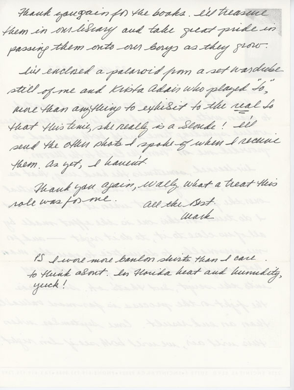 A close friendship between the actor and the astronaut sprung from this film and is reflected in this very personal hand written letter from Harmon. Harmon speaks about wanting to, "do it right" with regard to the effort that went into the accuracy of the film and for his depiction of Wally, states his intention "to do justice to you the man". There's even a joke about the Banlon shirts that Wally was well known for wearing. Harmon goes on to say, "...what a treat this role was for me". This letter also includes a production photo of Harmon and Krista Adair as Wally and Jo Schirra from the film set.
